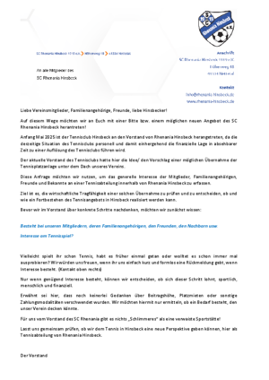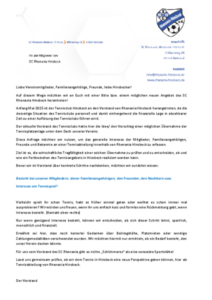 Anfang Mai 2025 ist der Tennisclub Hinsbeck an den Vorstand von Rhenania Hinsbeck herangetreten, da die derzeitige Situation des Tennisclubs personell und damit einhergehend die finanzielle Lage in absehbarer Zeit zu einer Auflösung des Tennisclubs führen wird.